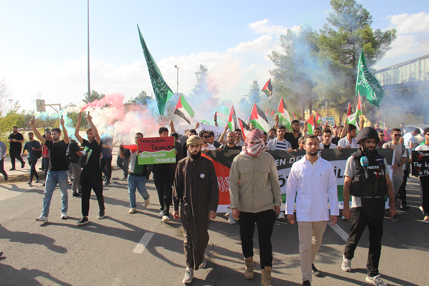 Aksa Tufanı Operasyonunun 2'nci yıldönümünde Gazze'ye olan desteklerini haykıran Dicle Üniversitesi öğrencileri, yaptıkları yürüyüşün ardından basın açıklaması düzenledi.