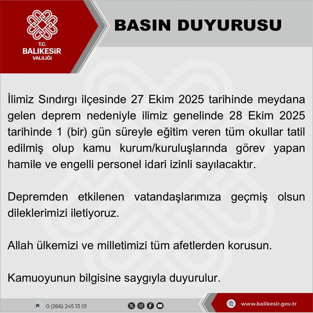 Valilikten yapılan resmi açıklamada, “İlimiz Sındırgı ilçesinde 27 Ekim 2025 tarihinde meydana gelen deprem nedeniyle 28 Ekim 2025 tarihinde il genelinde eğitim veren tüm okullar 1 gün süreyle tatil edilmiştir. Ayrıca kamu kurum ve kuruluşlarında görev yapan hamile ve engelli personel idari izinli sayılacaktır. Depremden etkilenen vatandaşlarımıza geçmiş olsun dileklerimizi iletiyoruz. Allah ülkemizi ve milletimizi tüm afetlerden korusun.” ifadelerine yer verildi.