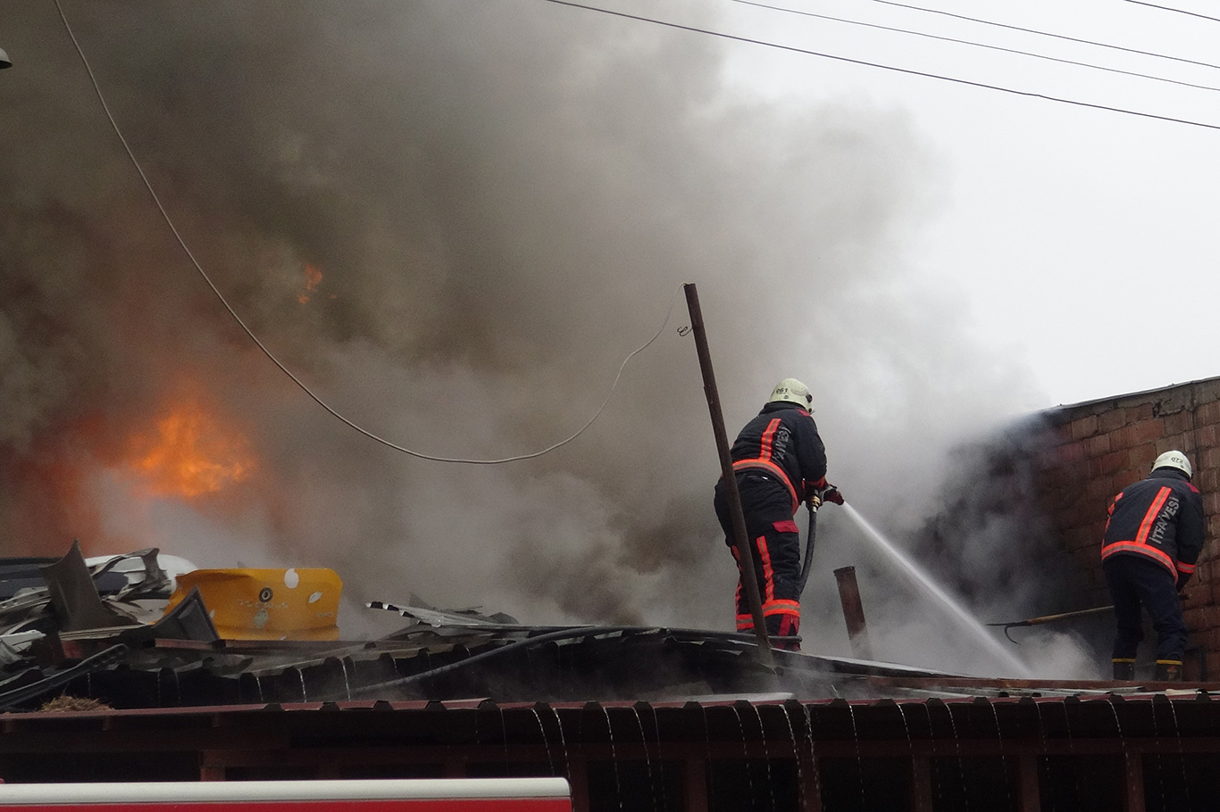 Aytaç Aybar isimli esnafa ait iş yerinde, çatı katında depolanan kaporta malzemeleri artığı, ısınan soba borusunun aşırı derecede kızışmasıyla alev aldı.