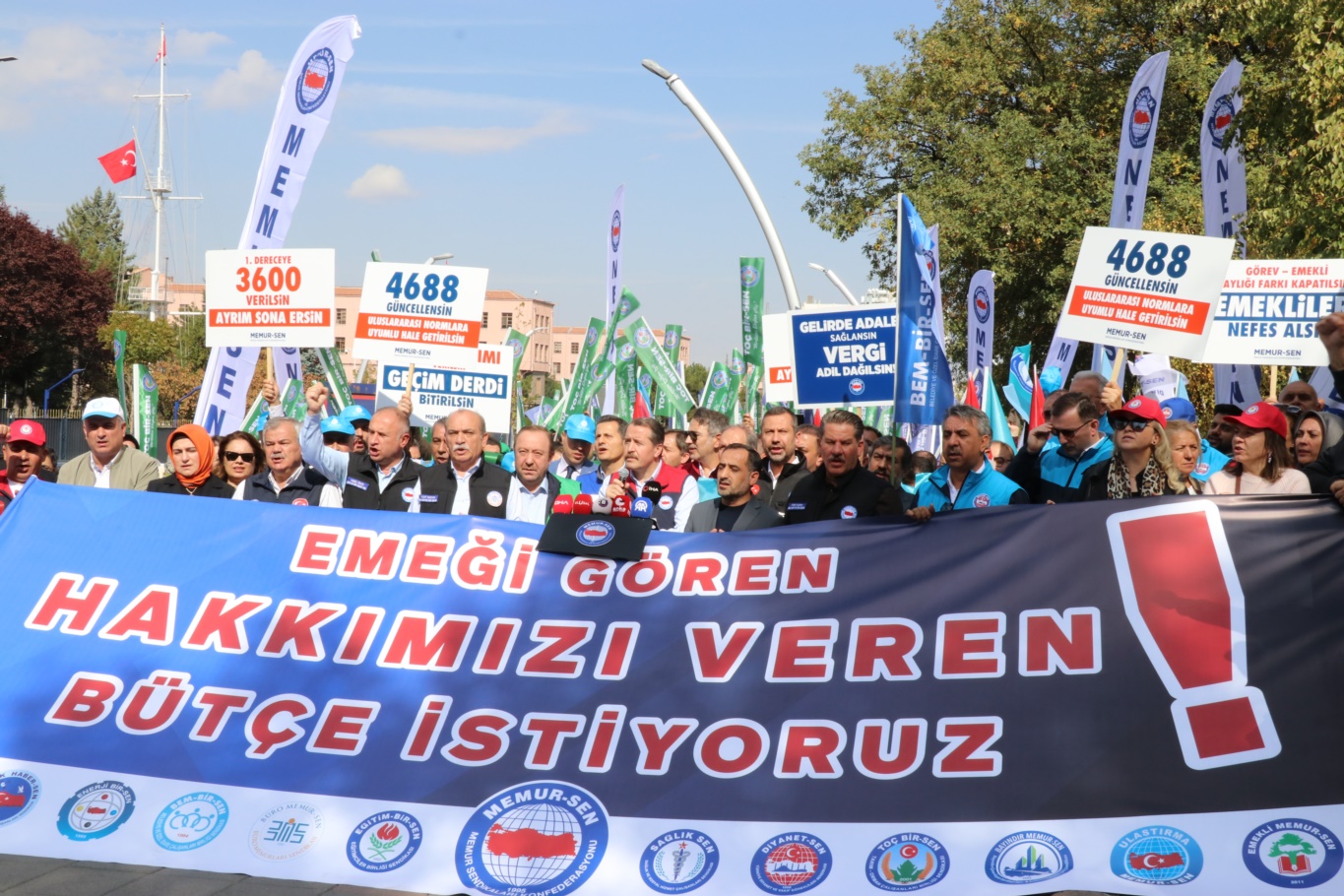“Emeği gören, hakkımızı veren bütçe istiyoruz” sloganıyla düzenlenen eylemde basın açıklamasını okuyan Memur-Sen Genel Başkanı Ali Yalçın, hükümete ve milletvekillerine seslenerek, adil bir bütçe çağrısında bulundu.
