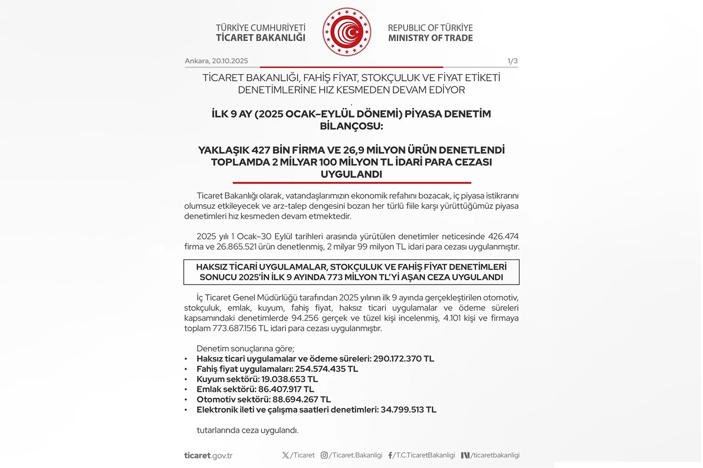Bakanlık tarafından yapılan açıklamaya göre, 1 Ocak – 30 Eylül 2025 tarihleri arasında 426 bin 474 firma ve 26 milyon 865 bin 521 ürün denetlenirken, bu denetimler sonucunda toplam 2 milyar 99 milyon TL idari para cezası kesildi.