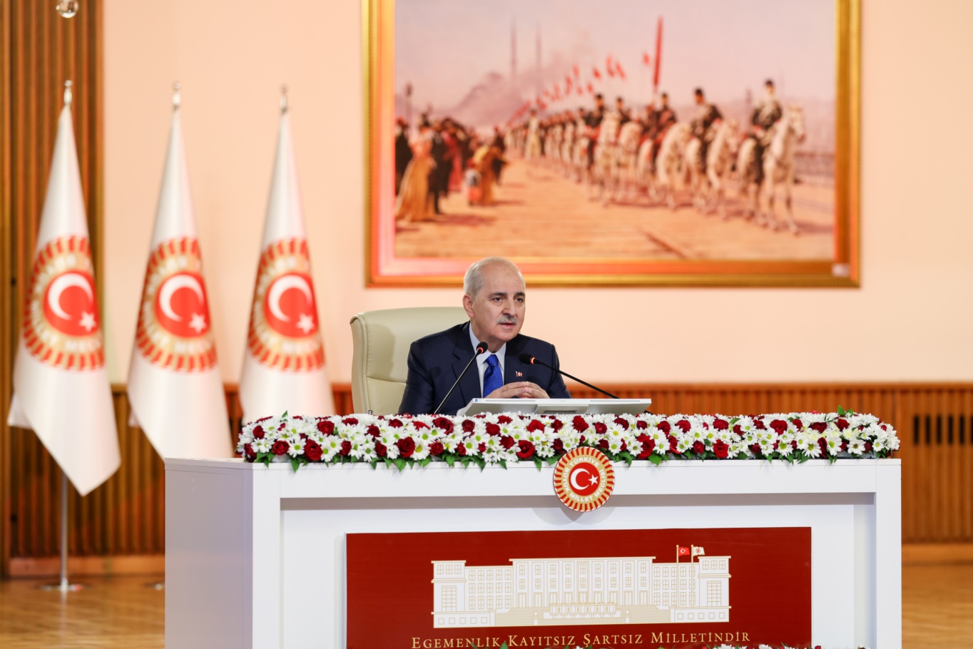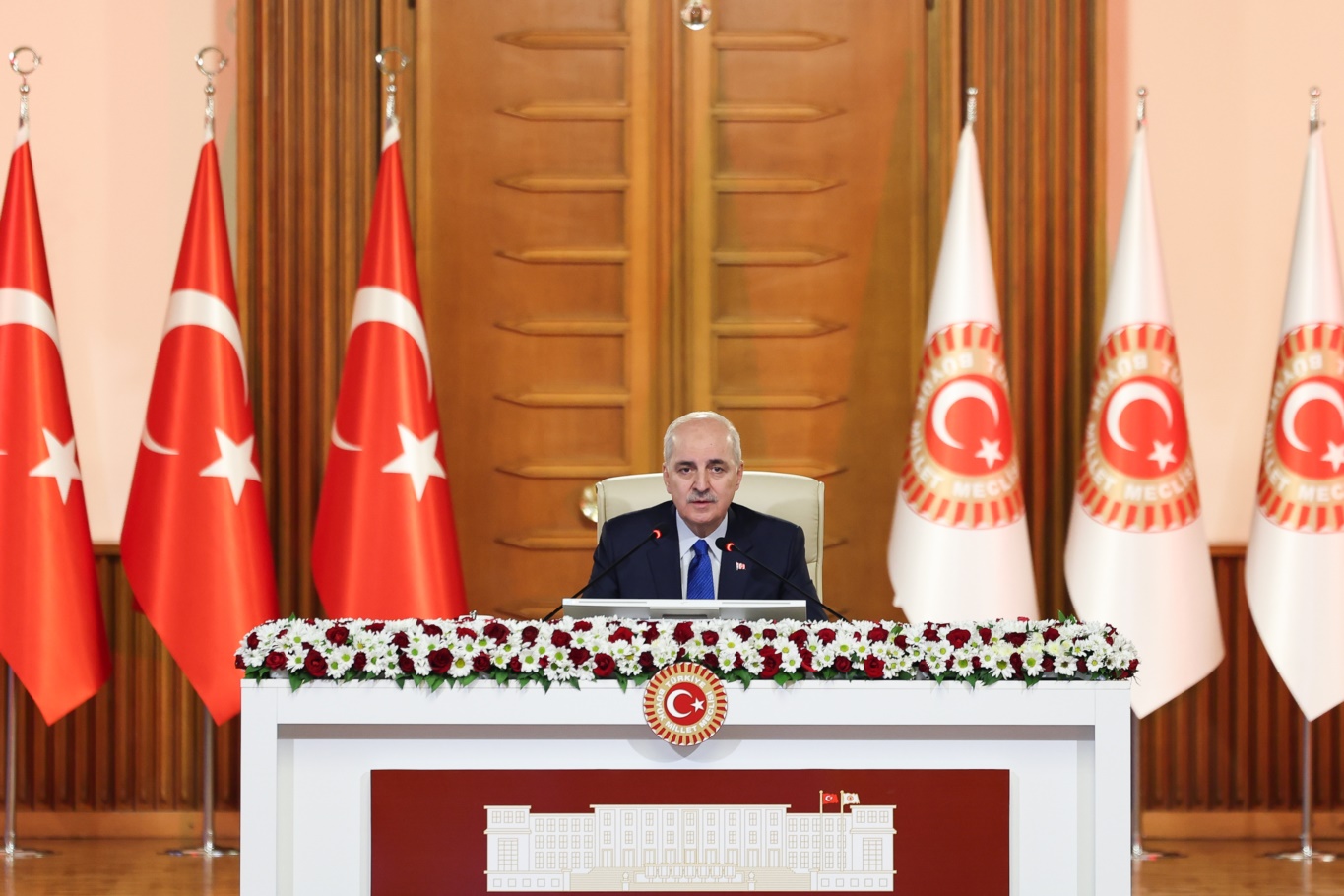 TBMM Başkanı Numan Kurtulmuş, Terörsüz Türkiye sürecinde gelinen aşamaya dikkati çekerek, “Bin düşünüp bir konuşmanın gerektiği günlere giriyoruz. Herkesin öncelikle bu sürecin bundan sonraki en hassas dönemini siyasi pozisyonlarının malzemesi haline getirmemesi lazım. Hepimizin siyasi fikirleri farklı, siyasi partileri farklı, anlayışları, kanaatleri farklı ama herhalde ortak olduğumuz nokta, artık bu memlekette silahlar sussun, terör sona ersin, analar ağlamasın, ocaklar sönmesin ve bu milletin geleceği bir şekilde karanlık ellere teslim edilmesin. Onun için özellikle ‘siyasi malzeme yapılmaması’ konusunu her birinizden istirham ediyorum.” dedi.