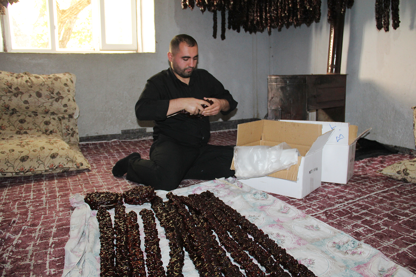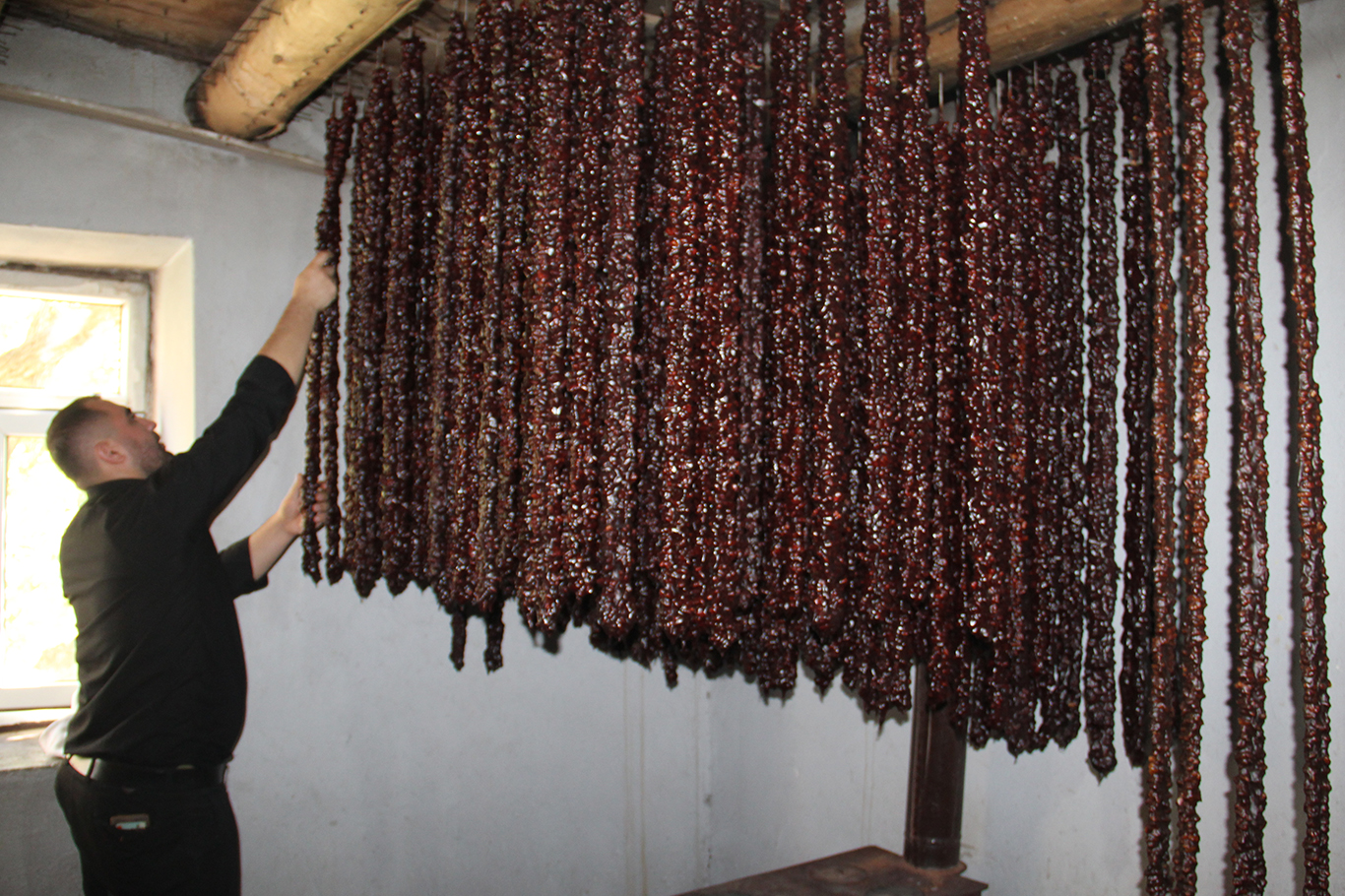 "Önce cevizleri iplerden geçiriyoruz, ardından pekmezli bulamacı hazırlıyoruz. Cevizleri bulamaçtan geçirip daldırıyoruz, sonra kurutmaya bırakıyoruz. Bu süreç en az dört-beş gün, bazen bir haftayı buluyor. Yani oldukça meşakkatli bir iştir."
