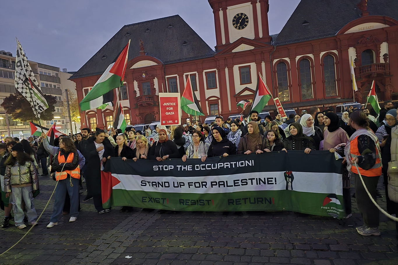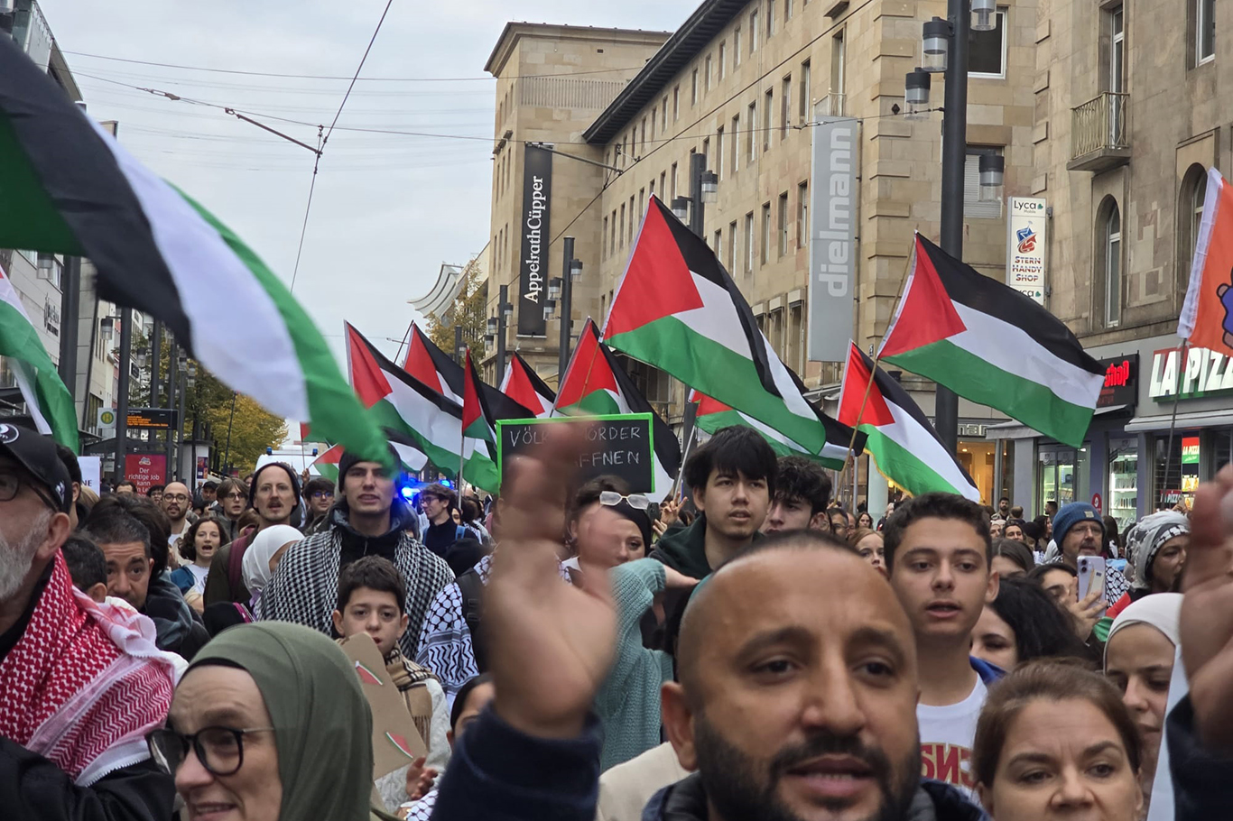 Protestocular, yürüyüş boyunca, "İşgal suçtur, israil'i boykot edin", "Ateşkes yetmez, Friedrich Merz yargılanmalı" (Almanya Başbakanı hakkında), “Ateşkes yetmez, Scholz ve Baerbock yargılanmalı” (Almanya’nın eski başbakanı ve dışişleri bakanı hakkında), "Özgür Filistin", “Nehirden denize Filistin özgür olacak” sloganları attı.