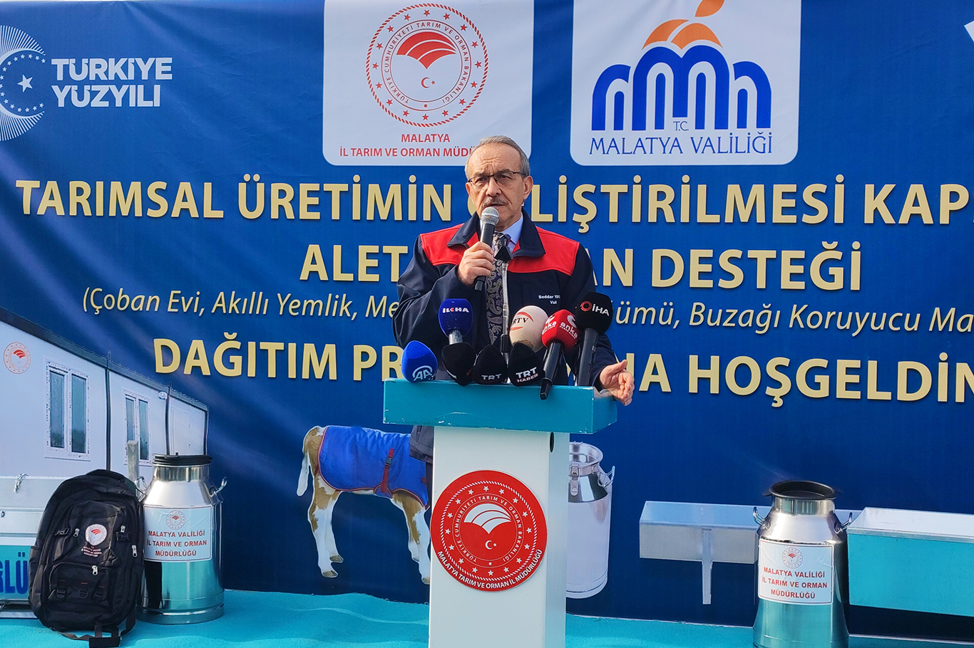 Malatya'da yaylalarda zor şartlarda üretim yapan yetiştiricilere konteyner çoban evi, akıllı yemlik, sıvat, süt güğümü ve buzağı malzemelerinin dağıtıldığı törende konuşan Vali Seddar Yavuz tarım ve hayvancılığın gıda arz güvenliği açısından stratejik öneme sahip olduğunu vurguladı.
