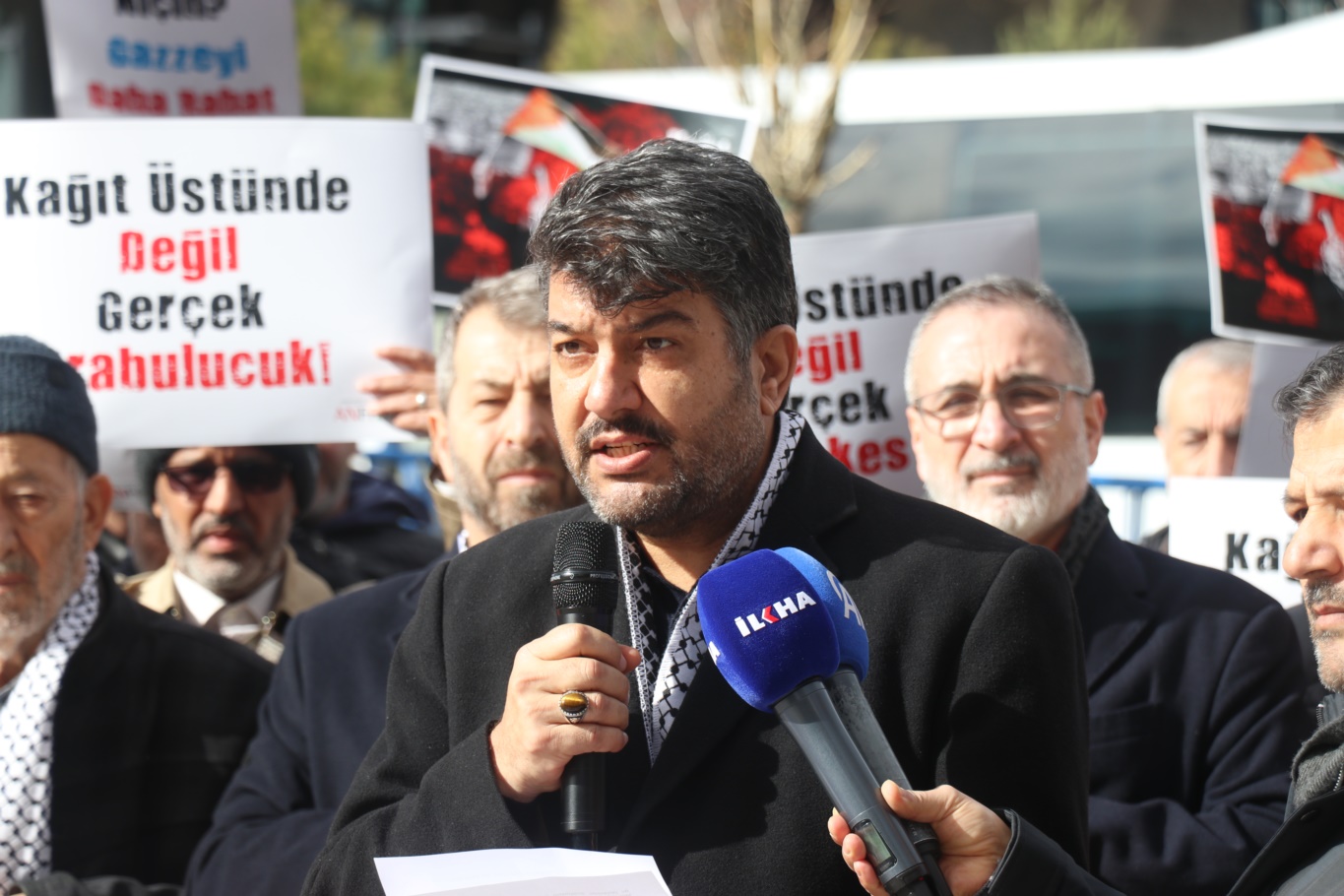 Karaman, "10 Ekim 2025'te yürürlüğe giren ateşkesten bu yana Filistin direnişi ateşkes şartlarına gereği gibi riayet etmiştir. Esirleri ve cesetleri teslim etmiştir. İşgalci israil anlaşmayı 1520 kez ihlal etmiştir. İsrailin anlaşmayı ihlal eden saldırılarında 566 Filistinli hayatını kaybetmiş, 1418 kişi yaralanmıştır. Ateşkes sürecinde israil 221 konutu yıkmıştır. Anlaşma kapsamında Gazze Şeridine günlük olarak 600 yardım, ticari mal ve yakıt tırının giriş yapması gerekirken ortalama 257 tırın girişine izin verilmiştir." diye konuştu.