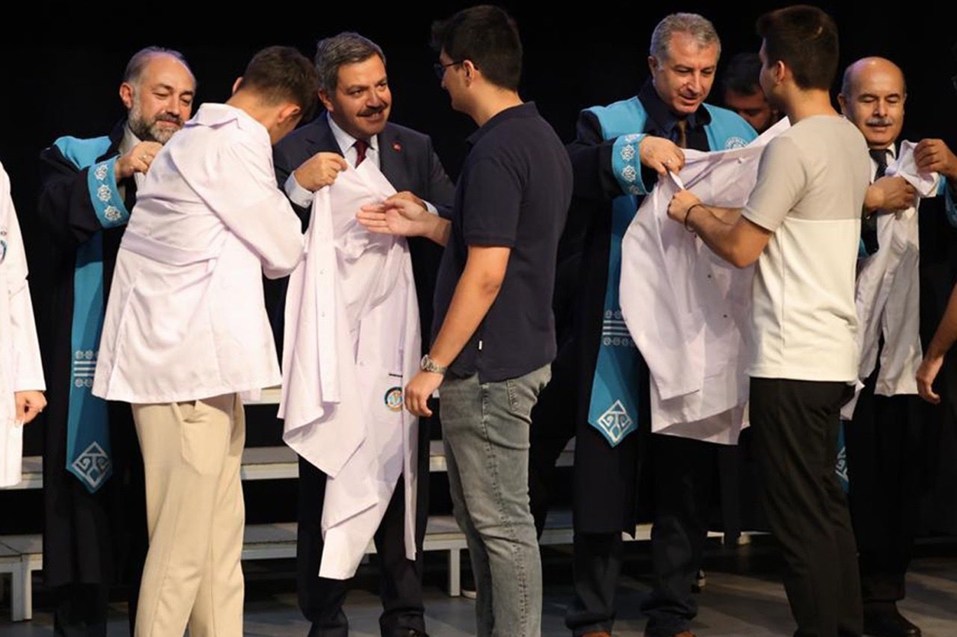 Törenin açılışında konuşan Rektör Yardımcısı ve Tıp Fakültesi Dekanı Prof. Dr. Ahmet Selim Özkan, hekimlik mesleğinin sadece bilgi ve teknik becerilerle sınırlı olmadığını vurgulayarak, "Tıp sadece bilgi ve beceri işi değildir. Aynı zamanda sorumluluk, merhamet ve dayanışma işidir. Bu yolculuk uzun bir maratondur. Bazen hızlı adımlarla ilerlemeniz, bazen durup derin nefes almanız gerekir. Sizler insan hayatına dokunan, en kırılgan anlarda umut ışığı olan bir mesleğe adım atıyorsunuz." dedi.