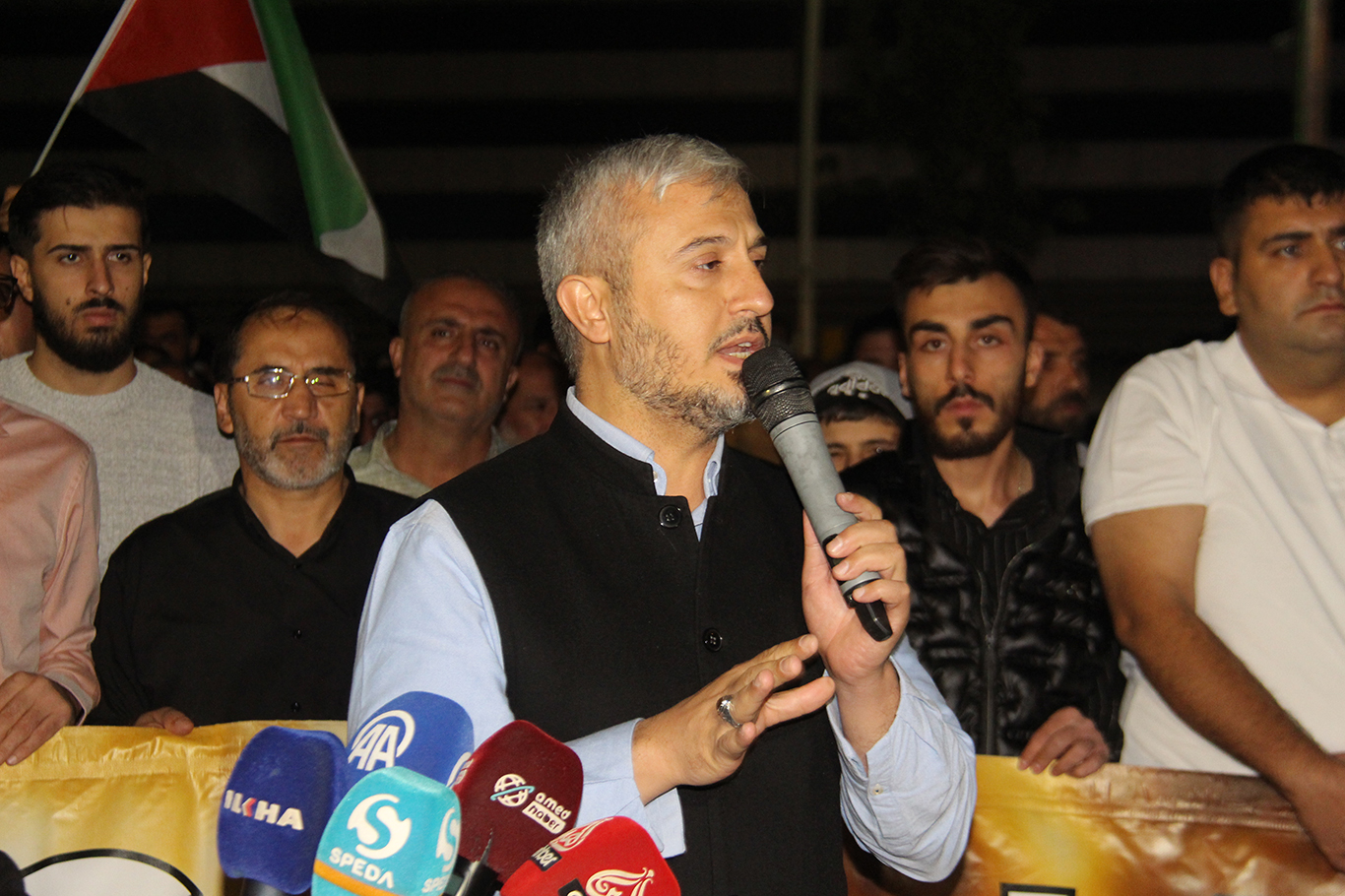 Çelik, "7 Ekim Aksa Tufanı'ndan beri sürekli meydanlarda HAMAS ve direnişin yanında olduğumuzu haykırıyoruz. Maalesef elimizden başka bir şey de gelmiyor. İnanıyorum ki cesur yürekli liderler eğer sınırları açarsa yüzbinlerce insan eline silahını, satırını ya da çakısını alarak zalim siyonistlerin üstüne yürüyecektir. Fakat maalesef bu işi organize edecek liderlerden mahrumuz. Maalesef İslam ülkelerinin başındaki liderler, siyonistlerle, ABD'yle, Batı'yla işbirliği içerisine girerek zillet elbisesini giymişler. Bugün ümmeti Muhammed'i çivi gibi yerine çıkan, dünya sevgisi ve ölüm korkusudur. Bakınız Körfez ülkelerinin aşağılık liderleri, dünya sevgisinden dolayı Amerika'nın ve siyonistlerin yanında yer alıyorlar. Sarı domuz Trump, bütün Arap ülkelerinin 21 maddelik zillet anlaşmasını kabul ettiğini açıkladı ve HAMAS'tan yanıt beklediklerini söyledi. 2 milyar Müslümanın yüzüne baka baka adam bunu söyleyerek aslında yüzümüze tükürüyor. 2 milyar müslümana rağmen 'Hamas bunu kabul edecek, başka çaresi yok' diyerek aslında yüzümüze tükürüyor, veyl olsun bize, veyl olsun idarecilerimize, veyl olsun o ordulara... 2 milyar Müslüman'a rağmen Gazze yerle bir ediliyor. 2 milyar müslümana rağmen Gazze açlıktan ölüyor. Nerede Arabın, Türk'ün, Kürdün izzeti? Ne oldu bize? Allah'ın bütün isimlerine yemin ederim ki Allah-ü Teala bu korkaklığımızı bize bırakmayacak." dedi.