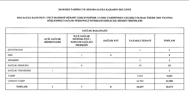 Resmî Gazete'de yayımlanan karara göre, Sağlık Bakanlığı önümüzdeki yıl 26 bin 673 sözleşmeli sağlık personeli istihdam edecek. Alımlar, eleman temininde güçlük yaşanan bölgelerde ve kritik hizmet alanlarında yapılacak.