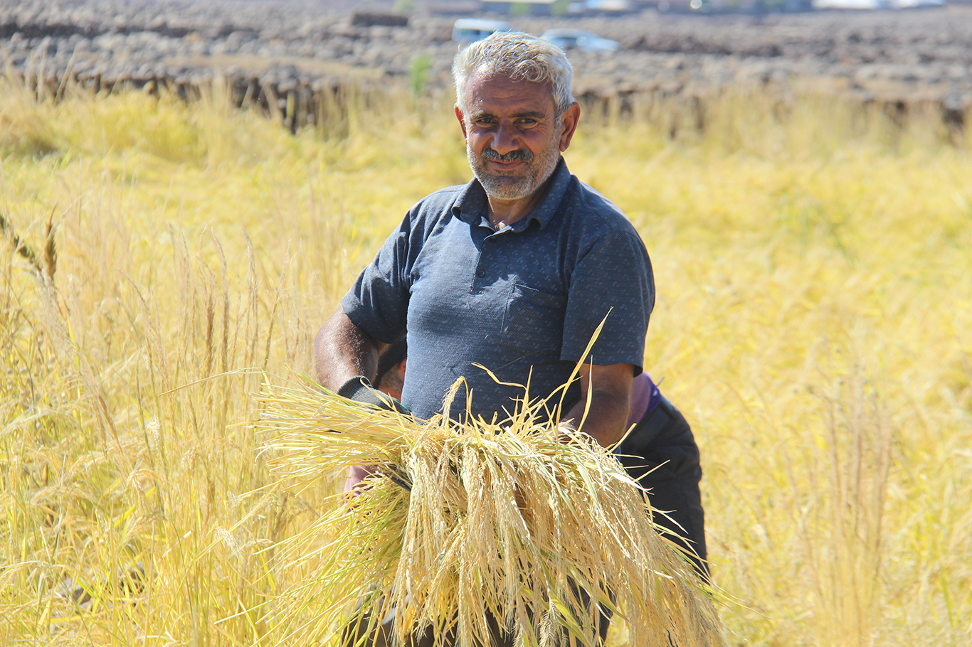 "Bu bizim ektiğimiz pirinç, Karacadağ pirincidir. Soğuk sondaj suyuyla suladık. Orijinal Karacadağ pirinci budur. Kayaların içinde yetişiyor. Karacadağ pirincinin tohumunu ekili arazilere atıp 'Bu da Karacadağ pirincidir.' diyorlar ama asıl orijinal olan budur. Bu hem gübresiz hem de doğaldır. Nisan ayında ekimine başladığımız pirincin hasadını ekim ayında yapıyoruz. Çok zahmetli bir iş. Hepsini oraklarla biçiyoruz. Topladığımız pirinci birkaç gün bekletip fabrikaya gönderiyoruz. Geçen seneye göre bu sene verim daha fazla ve güzeldi. Ektiğimiz pirincimiz bol bol su aldı."