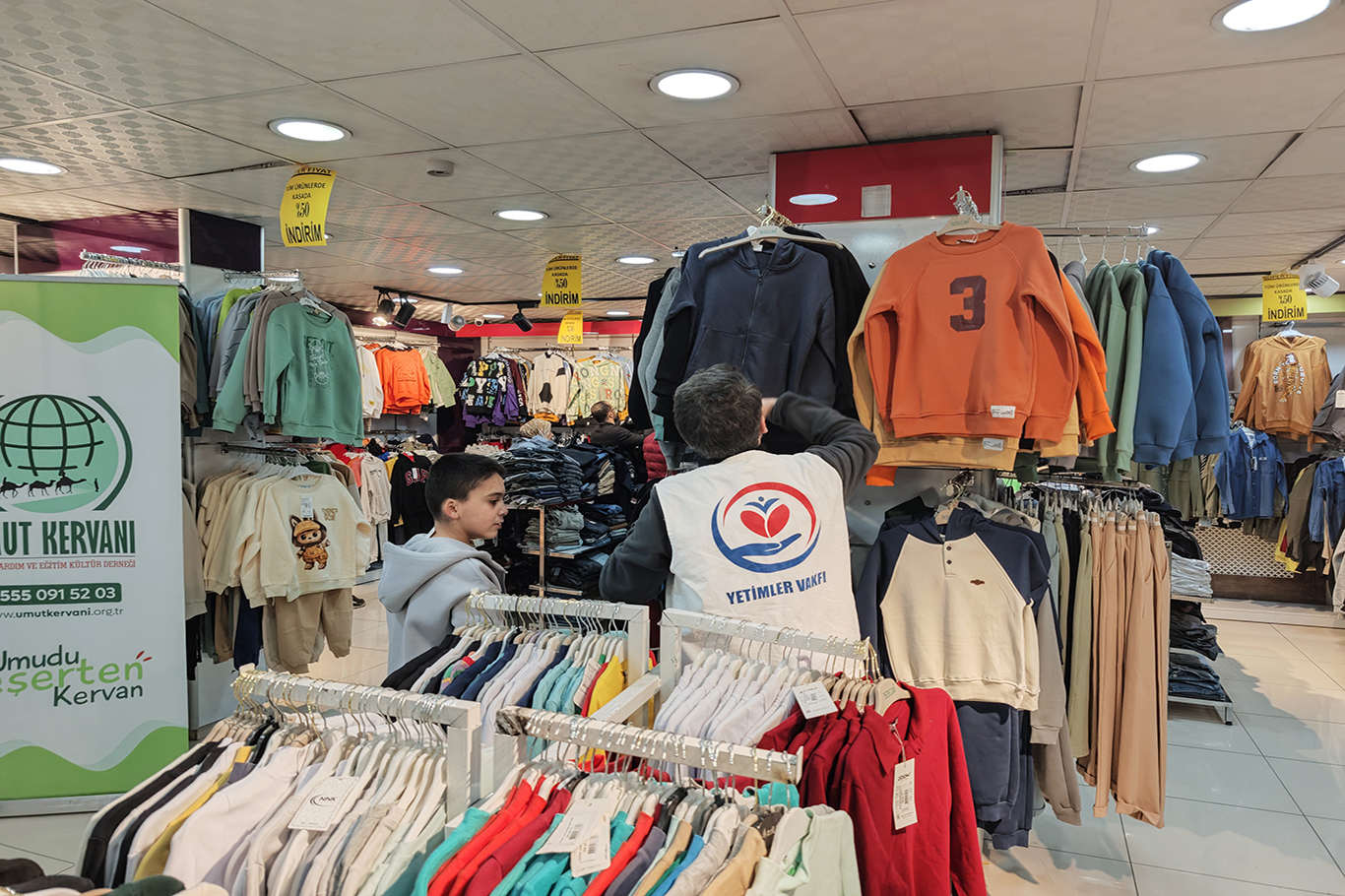 Yardım organizasyonu çerçevesinde çocuklar, aileleriyle birlikte kentteki bir giyim mağazasına götürülerek kışlık ihtiyaçlarını kendi beğenileriyle seçme imkânı buldu. Çocuklar mağazada mont, bot, kazak, pantolon ve diğer kışlık kıyafetleri diledikleri gibi seçerek aldı.